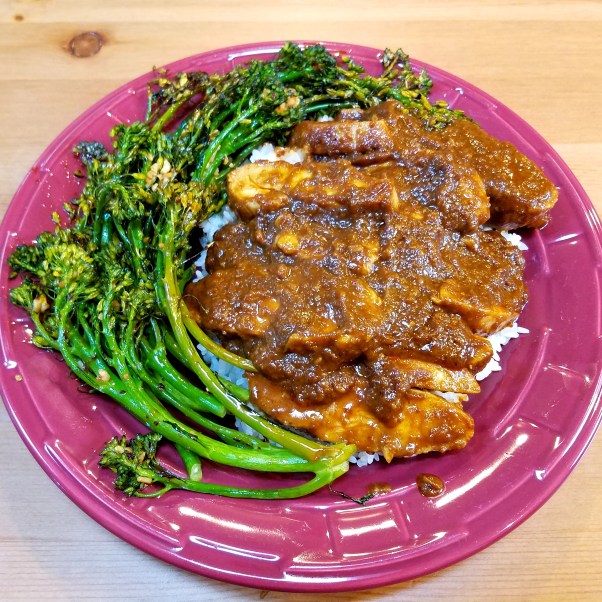 Chicken in Peanut Sauce with Black Vinegar, Sesame Oil, and Garlic Roasted Broccolini