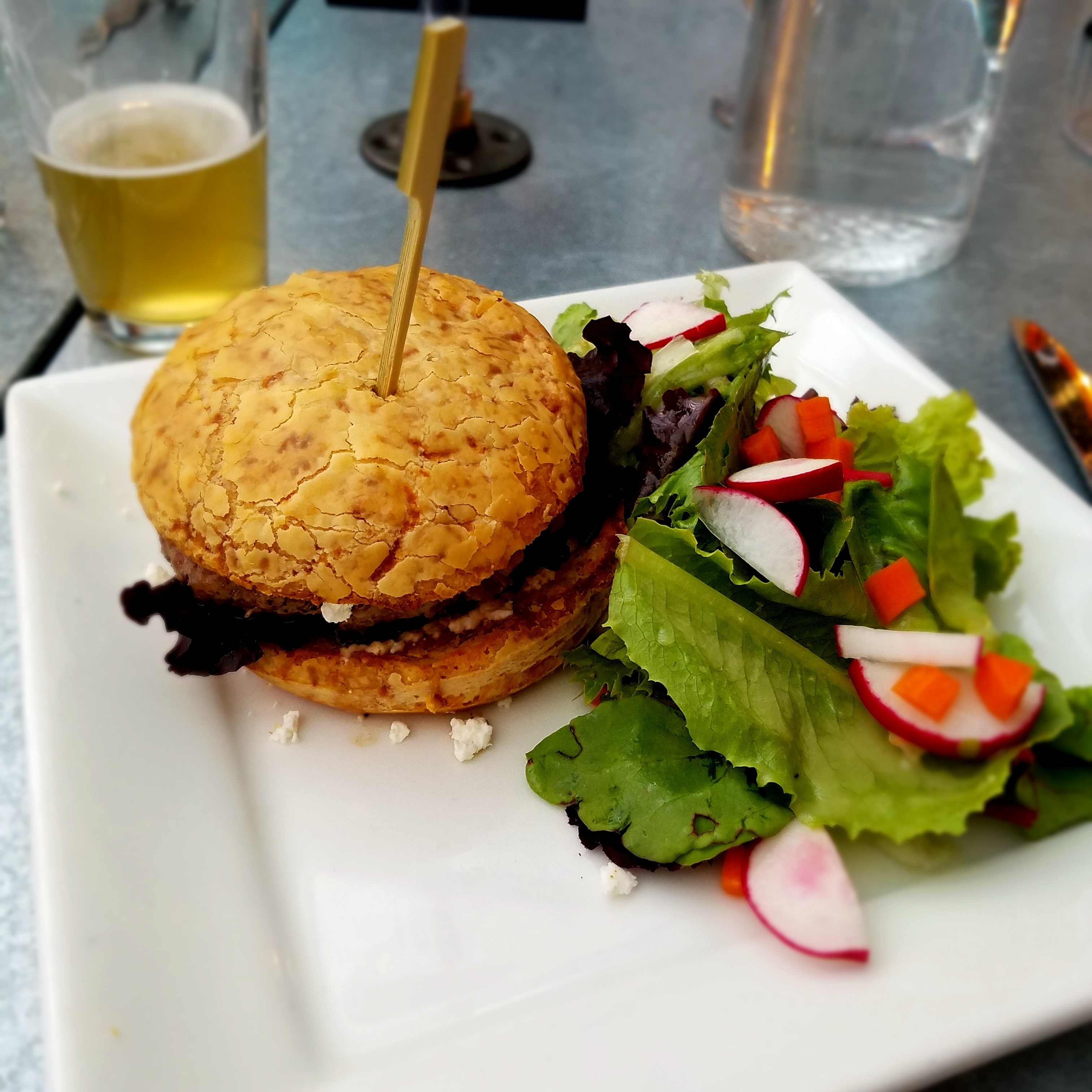 Garam Lamb Burger with Chevre and Rhubarb Chutney. And a Green Tea Golden Ale.