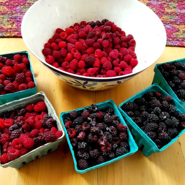 Lola is happy to be anywhere we are. My ill-chosen shoes fight gravity as I attempt the bush on the hill, trying desperately to not reach out and grab a handful of thorns, nor fall face-first into those thorns. Lola barrels under leaves and thru the vines, settling into a shaded spot square in the middle of the bush. She starts out by rescuing the berries I fail to catch, then digging holes, perhaps offering some sort of burial to them, but simply kicking dirt onto my feet. She runs happily, up and down the hill, as our buckets grow full. Until the sun reaches its peak, chasing moisture down our brows and necks. And when it begins to feel like work, we trudge back up the hill, and drive home, our buckets full and our fingers red.
