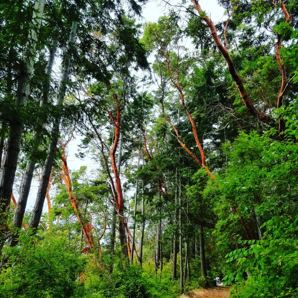 We find a wooded path and I am surprised by how far from the sea it feels. It is thick with foliage and smells of tea. I step over dandilions, stretching the length of their stalks across the path, as if they too are craving the sea. Above us, long slender branches reach across, their bark coming away to reveal deep red skin. It is almost like the selkie that sheds its seal skin to stride upon the land on two feet. These trees seem like a snapshot, frozen in time mid action of doffing their tree skin, to return to the sea as something else.