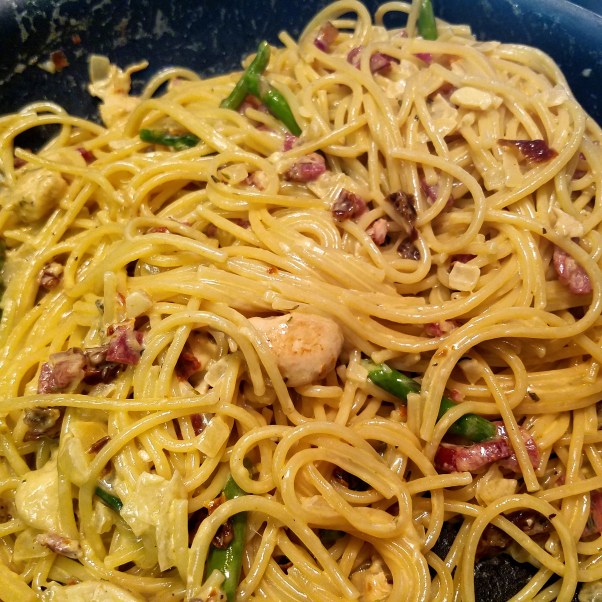 Bacon, Onion, Chicken. Asparagus, Sun Dried Tomato. Garlic, Lemon, Thyme, Anchovy. Chicken Broth, Heavy Cream, Parmesan Cheese. Cracked Black Pepper.
