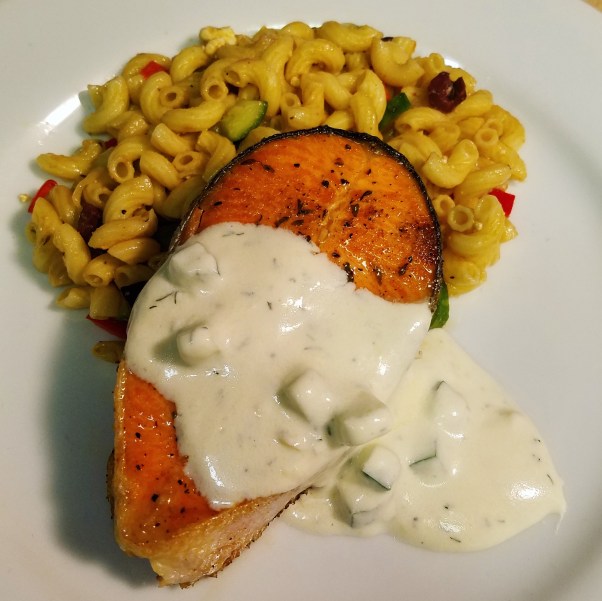 Salmon with Tzatziki Sauce and leftover Greekish Pasta Salad.