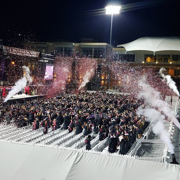 The graduation was scheduled for 7pm. Nothing really ever happens on time, but it wasn’t too late in starting. It was cold, the sun went down and the wind was persistent. The Duffer Brothers, alumni of Chapman University waxed inspirational to the graduates. Telling them how amazing they’re all going to be… just not right now… Maybe in like a decade.