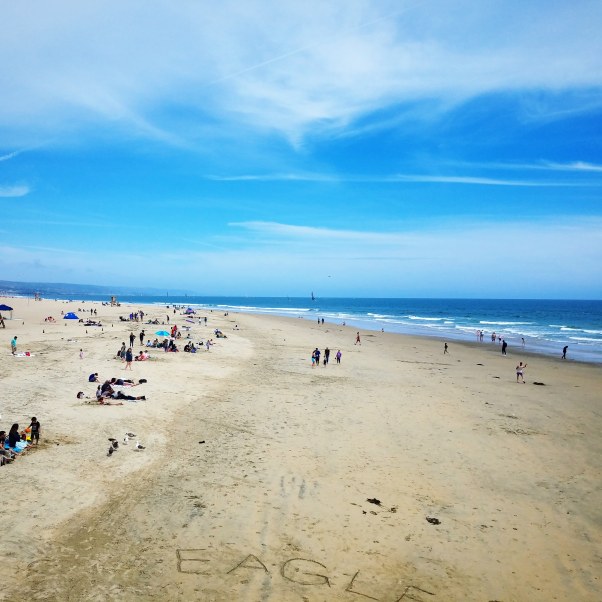 But the sand was warm, and the sky was blue. It smelled like dead fish, but hey, it’s the beach. Families fishing off the pier, and it must have been good fishing, cuz a pod of porpoises were boppin’ about, and a lone sealion swam about near the pier.