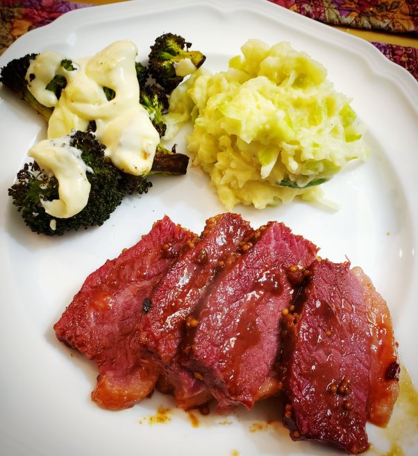A quick 10 minutes in the oven for the whiskey glaze to get friendly with the beef, and it’s all done. No boiled cabbage or carrots. The meat is tough from unsupervised aggressive boil while I took a nap. But shit, we can’t all be perfect.