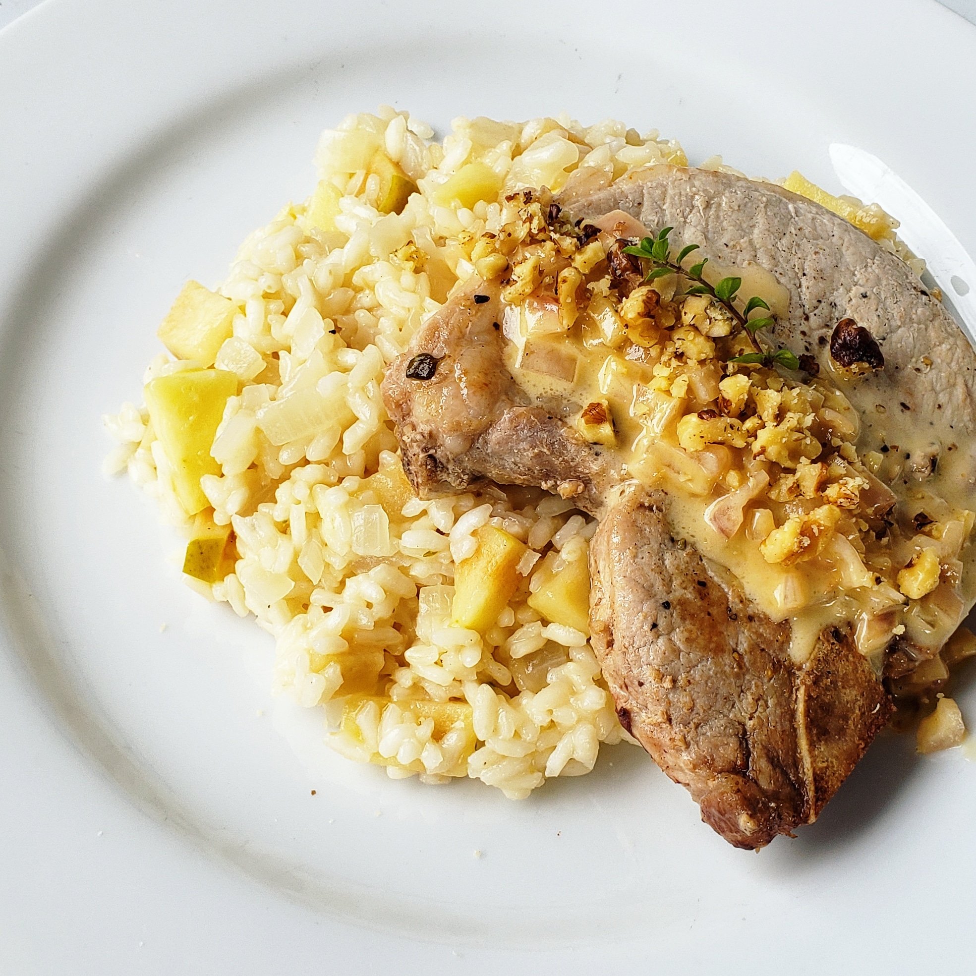 Pork Chop with a Cider Cream Sauce, and Toasted Walnuts Posted June 6, 2020 Filed under Food Over Apple Risotto