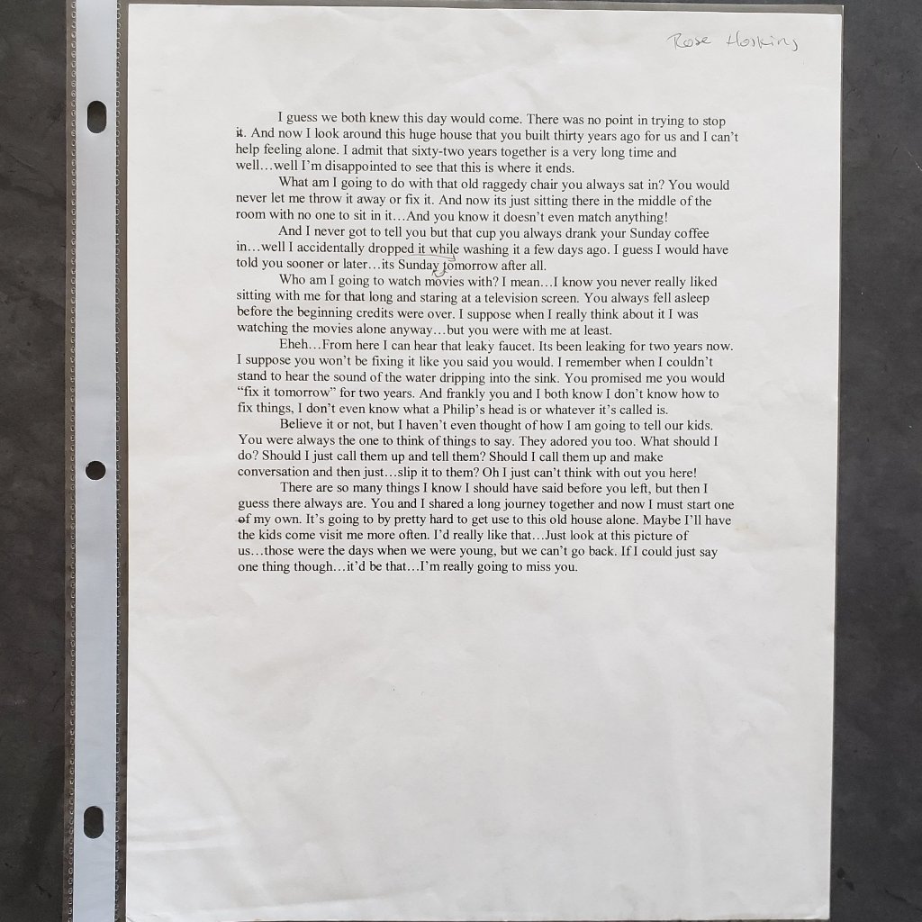 There are so many things I know I should have said before you left, but then I guess there always are. You and I shared a long journey together and now I must start one of my own. It’s going to be pretty hard getting used to this old house alone. Maybe I’ll have the kids come visit me more often. I’d really like that… Just look at this picture of us… Those were the days when we were young, but we can’t go back. If I could just say one thing though… it’d be that… I’m really going to miss you.