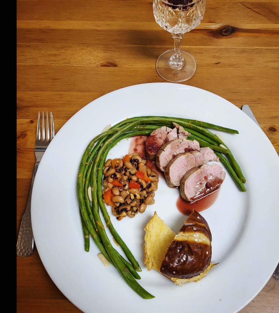 Pork Loin with Grape and Pomegranate Sauce, Pan (not so) Fried Black Eyed Peas, Citrus and Honey Green Beans, and Buttered Pretzel Bread.