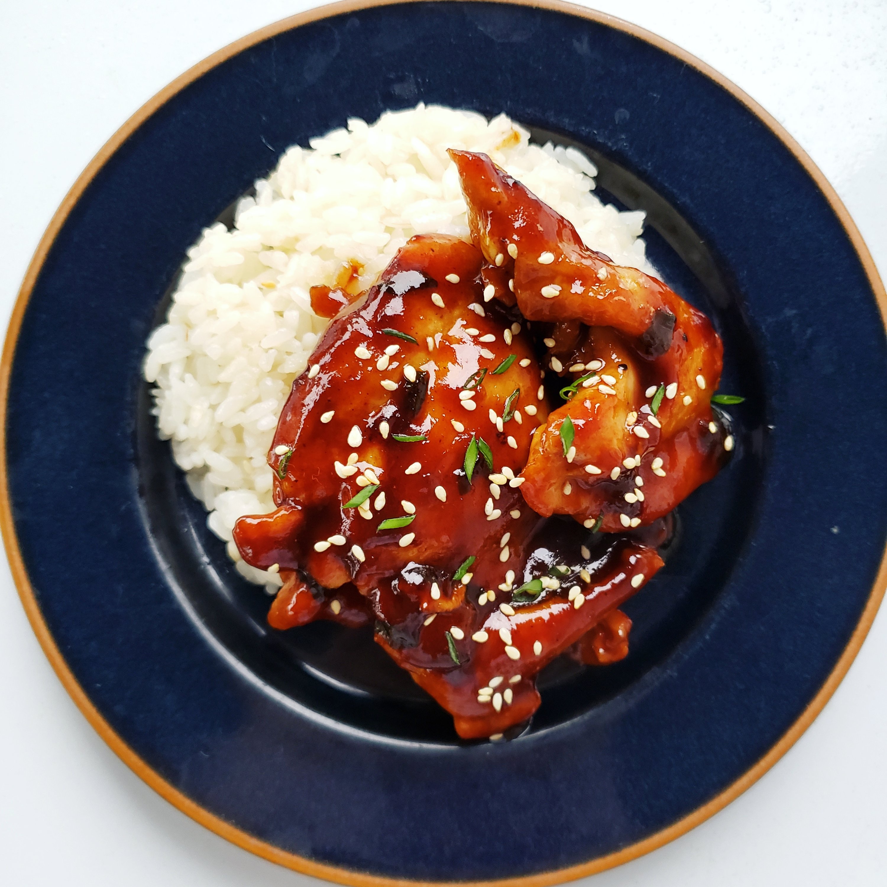 Plum Sauce with Soy and 5-Spice glazed Chicken, over Coconut Rice