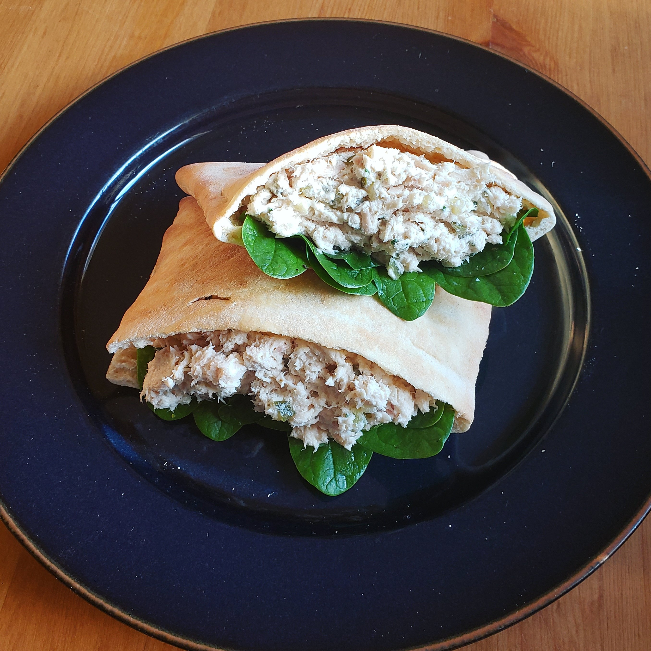 My Weird Tuna Pita. Tuna with chopped Pickle, Rosemary, and Chives, and Horseradish and Mayo. With Spinach dressed in Lemon Juice and cracked Pepper.