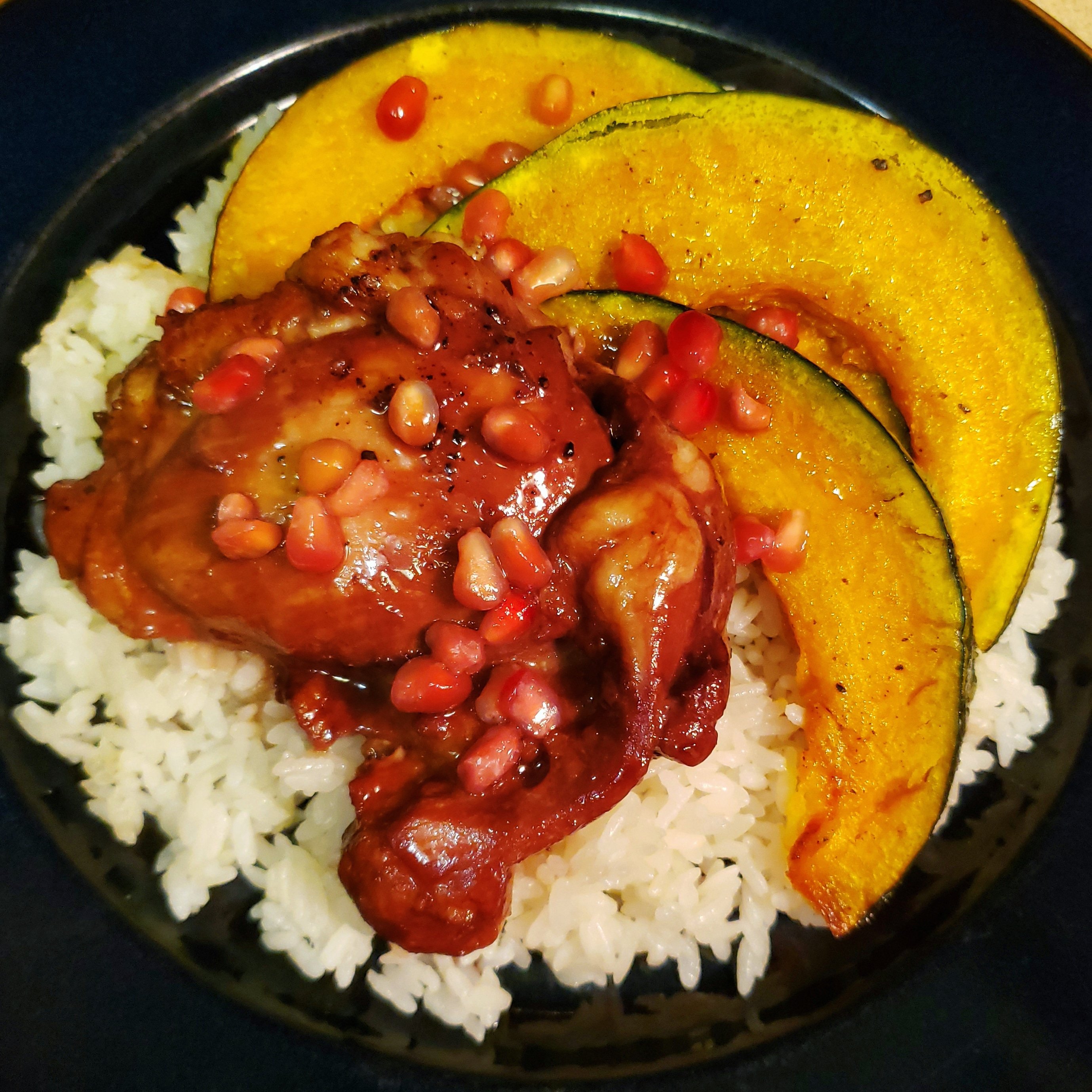 Pomegranate Chicken, with Roasted Kabocha Squash, over Coconut Rice