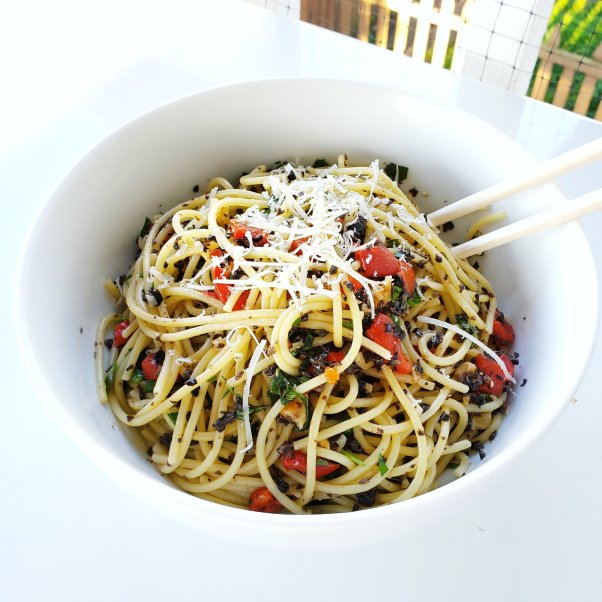 Spaghetti, Chopped Olives, Roasted Red Peppers, Toasted Walnuts, Parsley, and Basil.