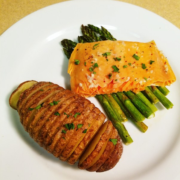 I served the Hasselback Potato with a piece of Garlic Lemon Butter poached Salmon, over Roasted Asparagus.