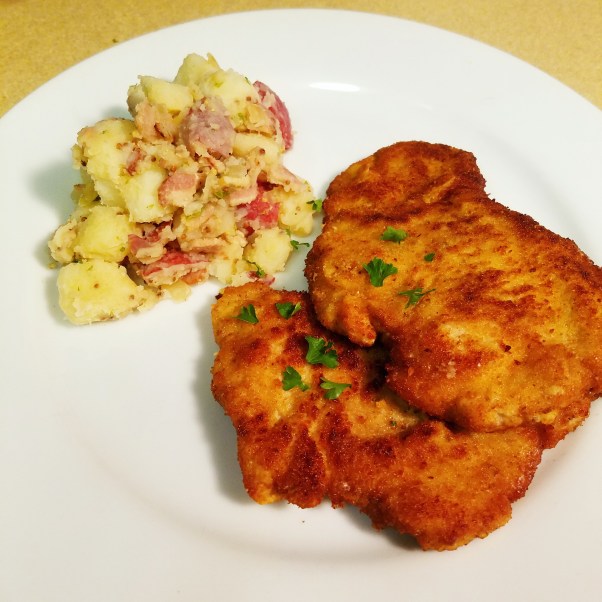 To go with the salad I hammered out some Pork Cutlets, breaded, and fried them, to make Pork Schnitzel.