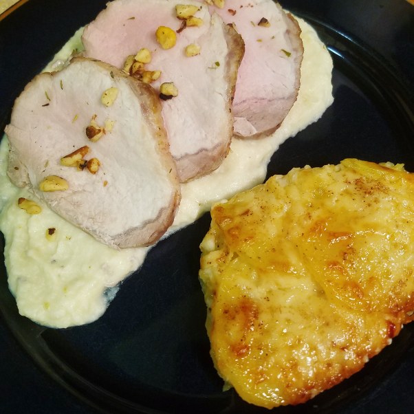 I was very ambitious with this one. I served the Gratin with Roasted Pork Loin, over an Apple Cider Cream Sauce.