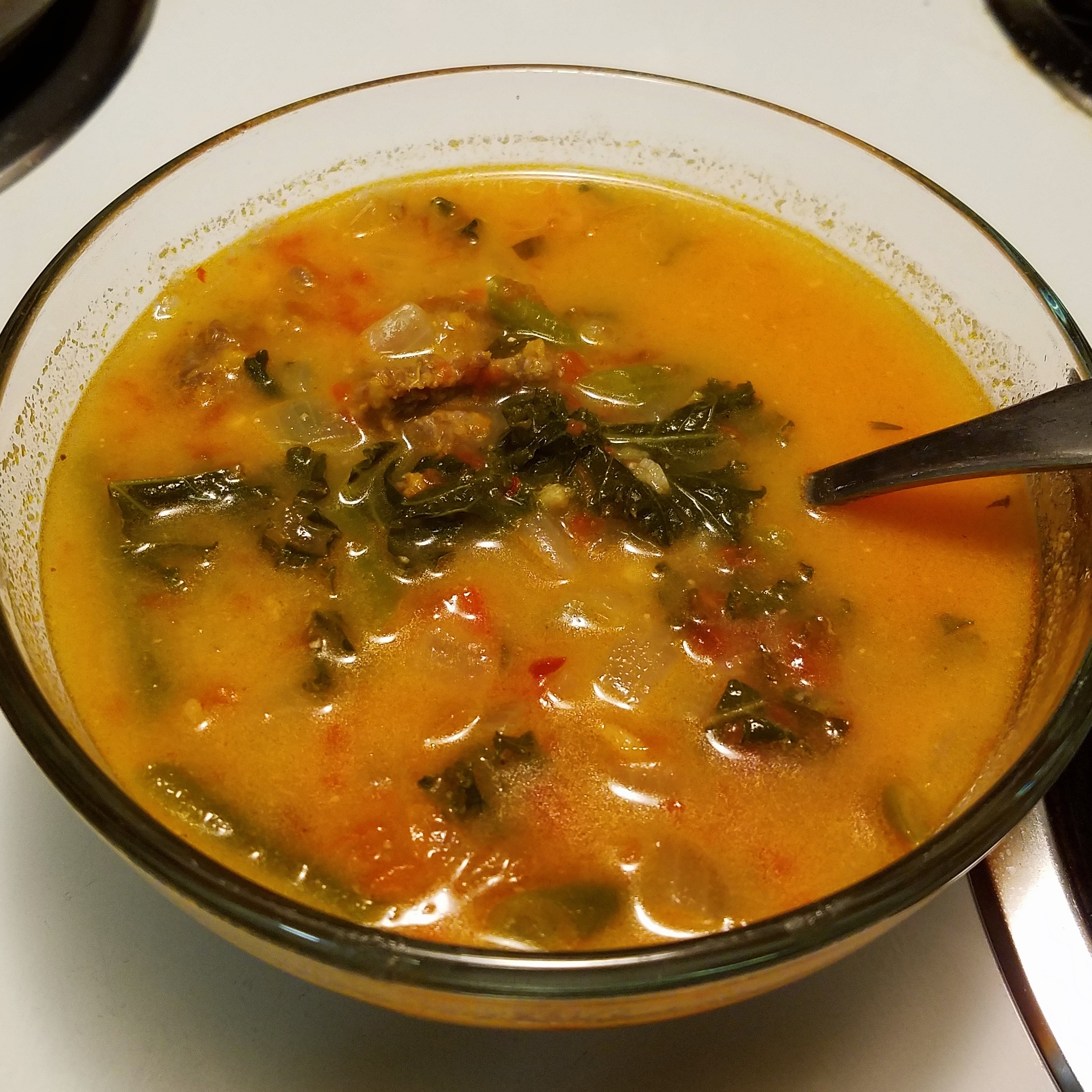 Night 2: Sausage, Kale, and Green Bean soup, Thickened with Pureed Poatatoes and Heavy Cream. And a piece of Toast..