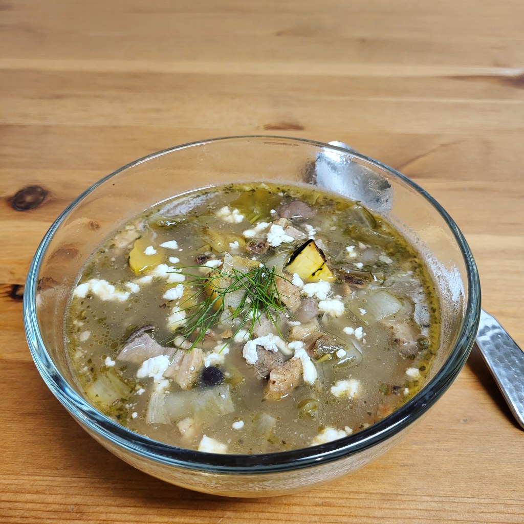 Night 7: Chicken and Wild Rice Soup, with Garlic Green Beans, some leftover Squash pureed, and Broth made from the bones of my enemies… I mean from my Cornish Hen carcasses…