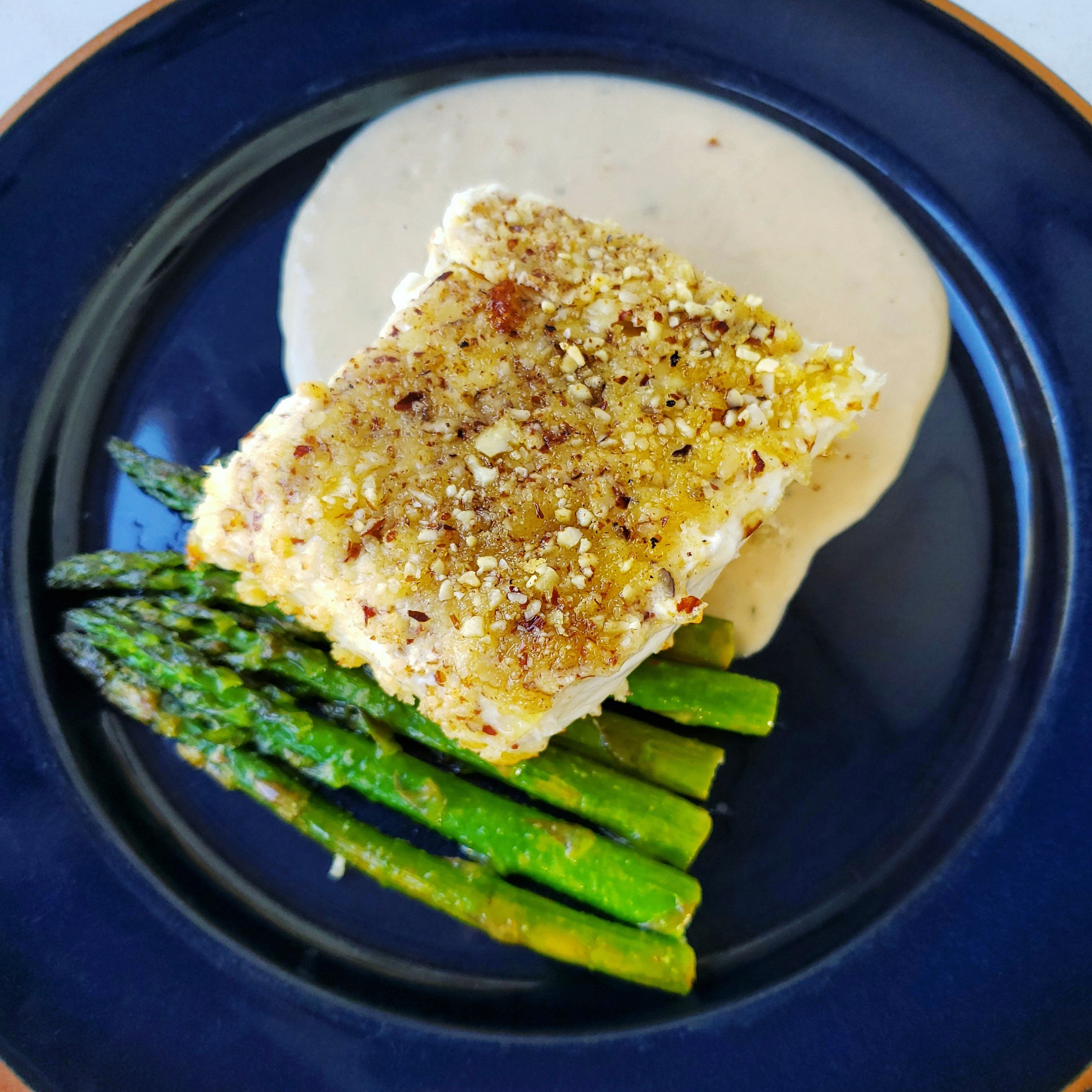 Almond Crusted Halibut Posted July 30, 2019 Filed under Food With Lemon Garlic Roasted Asparagus, and Rosemary White Bean Puree