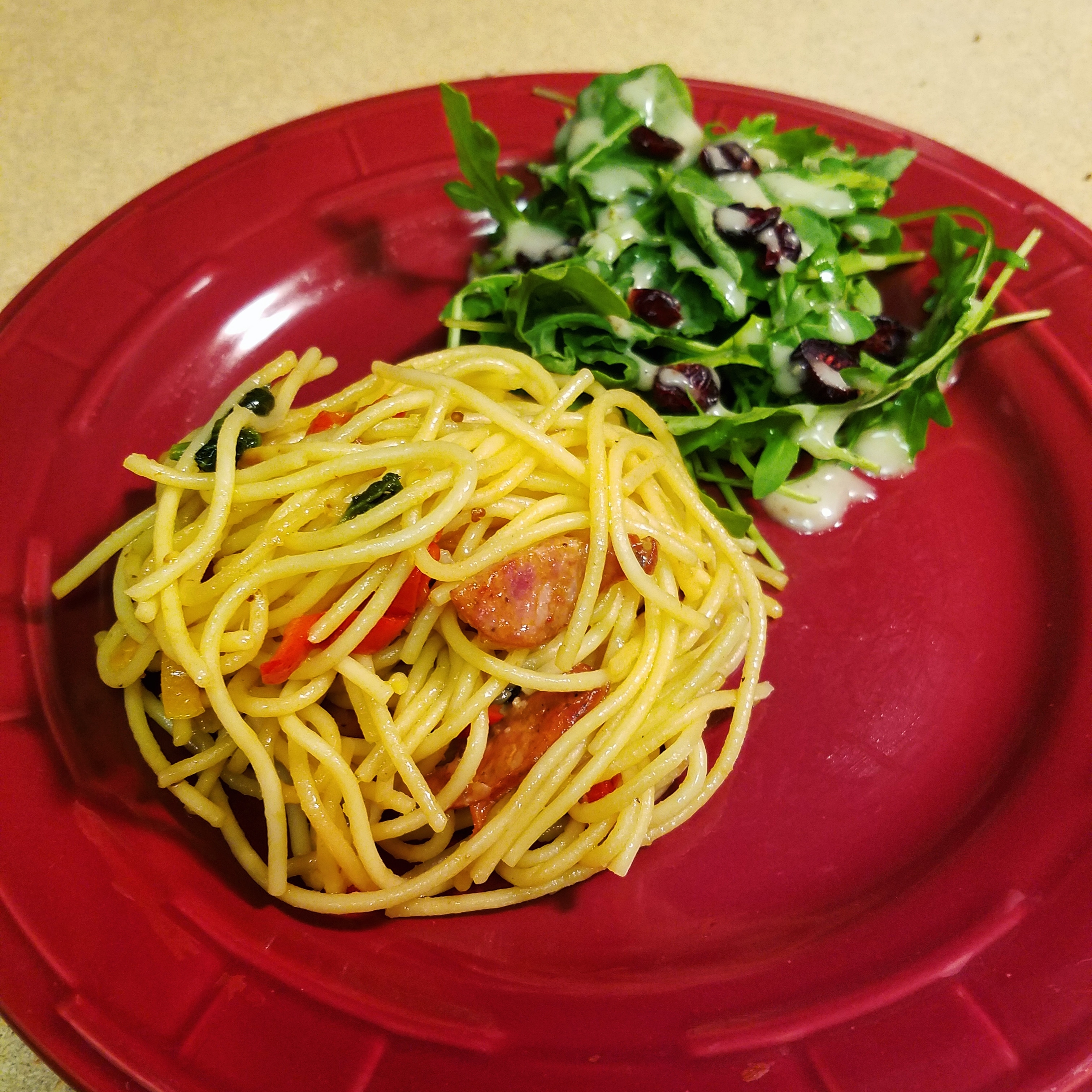 Sausage Peppers and Onion Pasta with Dijon and Parmesan, and Arugula Salad with Cranberries and Apple Dijon Vinegarette (bagged)
